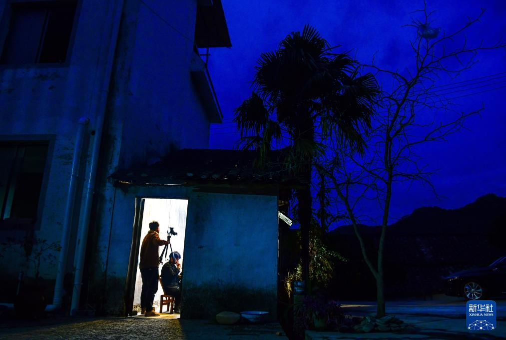 “念乡人周周团队”在拍摄品尝竹笋鸡的短视频素材(2023年12月11日摄)。