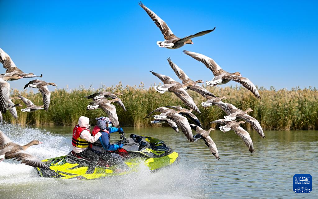 10月2日,游客在沙湖景区乘坐快艇时大雁在一旁飞翔。当日是国庆假期的第二天,许多游客来到宁夏石嘴山市沙湖景区,感受沙漠与湖泊相依的独特景观。