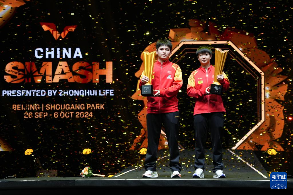 10月6日,男单冠军林诗栋(左)与女单冠军孙颖莎在颁奖仪式上。