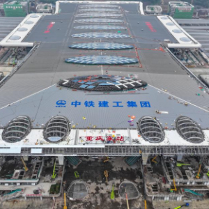 国庆假期,由中铁建设、中铁建工等单位承建的重庆东站站房及配套综合交通枢纽工程加紧建设。工人们坚守岗位,抢抓施工进度。