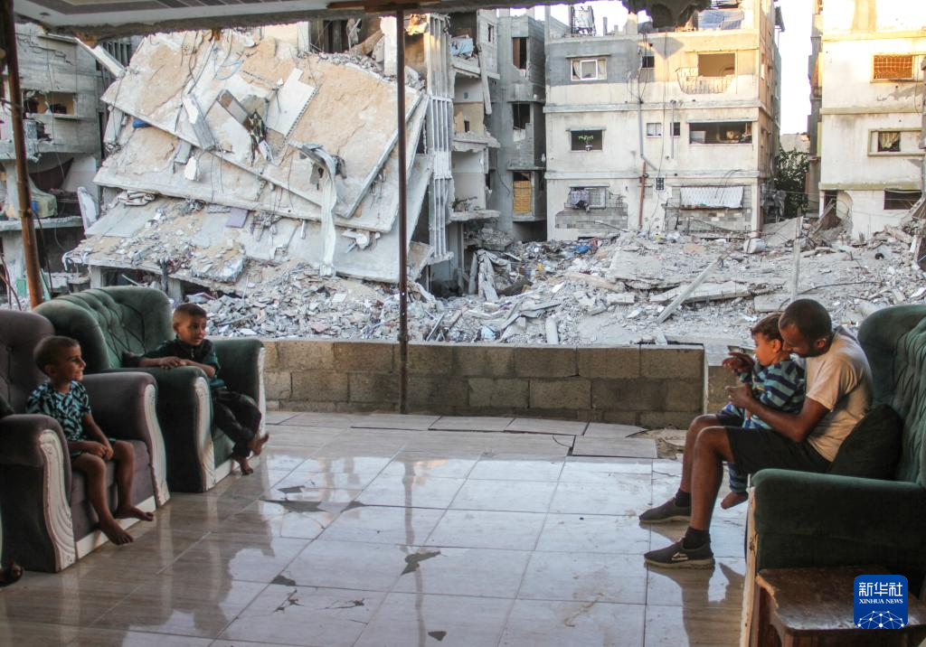 10月6日,在加沙地带北部杰巴利耶,人们坐在建筑废墟附近。