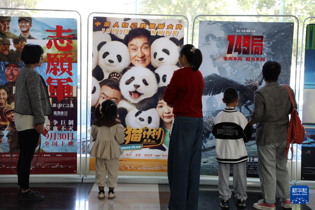 10月7日,在山东省临沂市郯城县一家影城,观众从电影海报前走过。