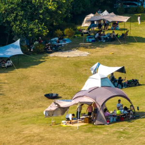 10月7日,在广西柳州市鱼峰区白沙镇,市民在柳江边搭起帐篷露营(无人机照片)。