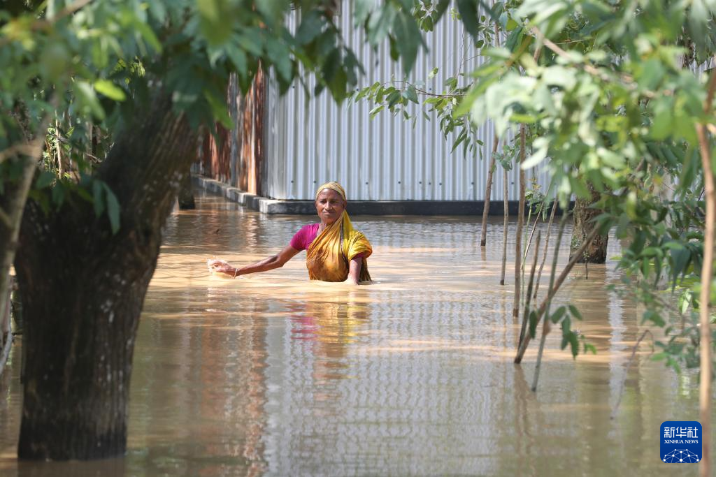10月7日,在孟加拉国迈门辛,一名女子涉水出行。