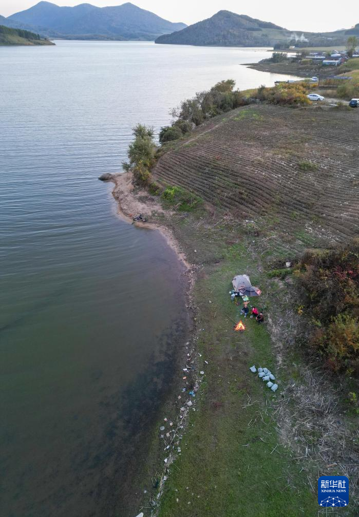 在吉林省吉林市松花湖岸边,露营爱好者在搭建帐篷,垃圾散落在附近(10月2日摄)。