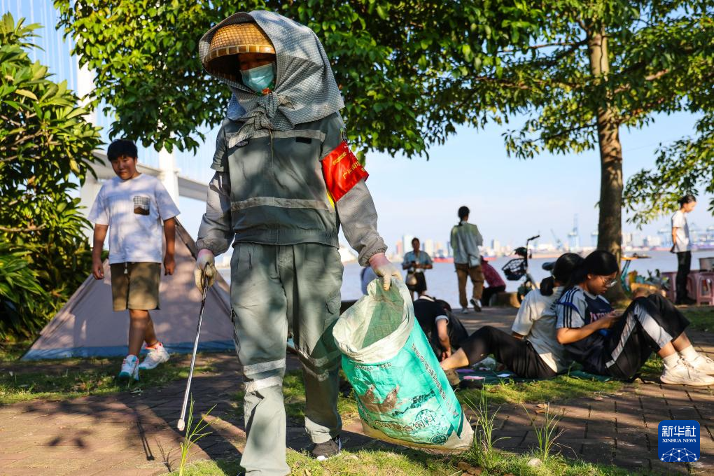 在广东广州番禺海鸥岛露营地,环卫工人进行保洁工作(10月2日摄)。该露营点配备了保洁人员。当地出台相关文件积极推动绿地开放,倡导“无痕露营”。