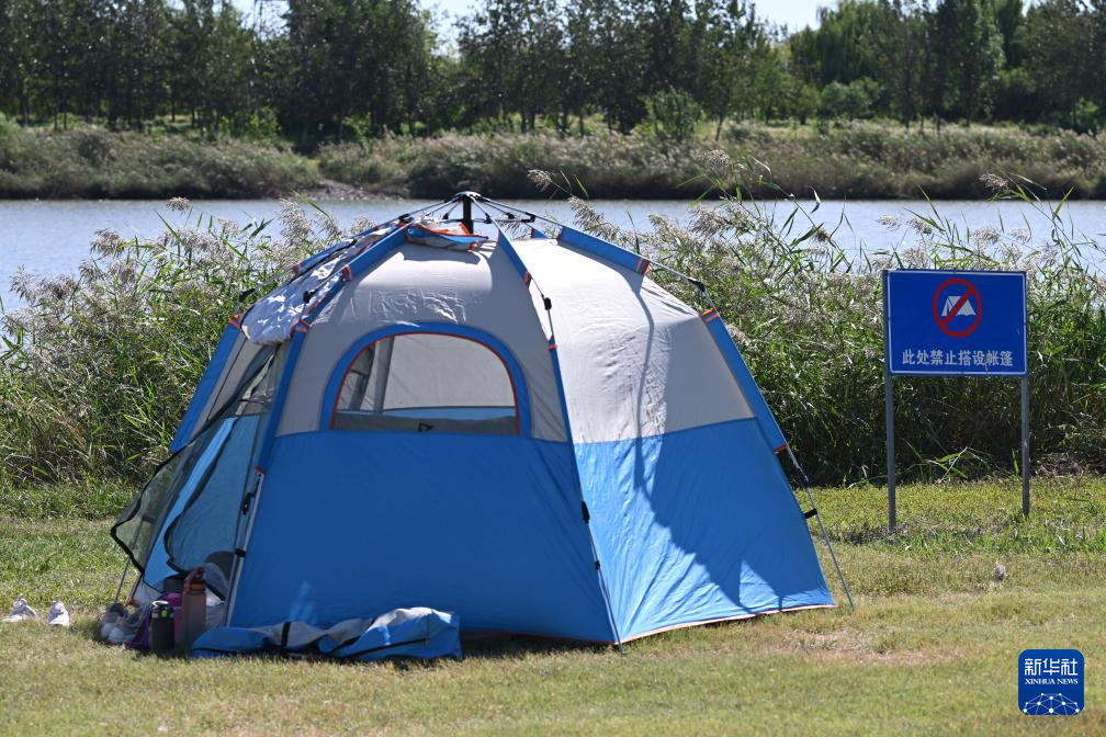 在天津某郊野公园,露营者将帐篷搭设在河道边,旁边有“此处禁止搭设帐篷”的提示牌(10月2日摄)。