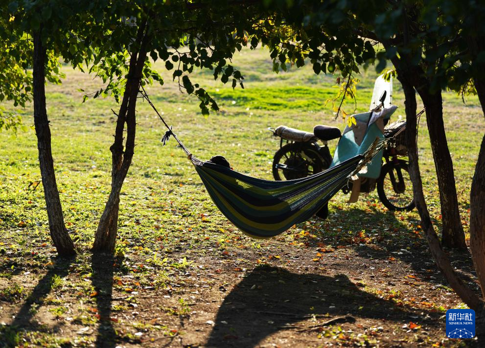 在辽宁沈阳一露营地,一名男子将电动自行车骑入绿地,在两株并不粗壮的小树之间搭了吊床(10月7日摄)。