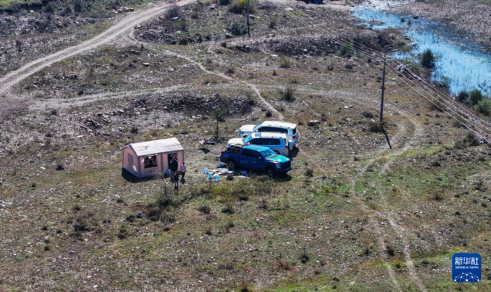 内蒙古呼和浩特附近一处自然保护区,露营者将车开进河道,就地露营(无人机照片,10月4日摄)。