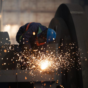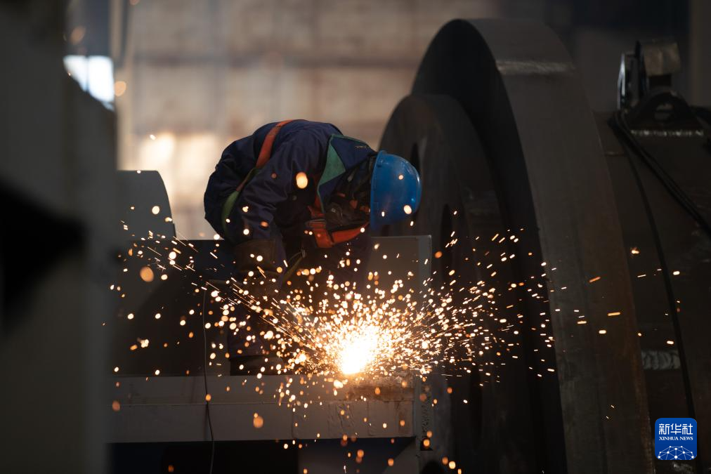 10月8日,工人在江苏连云港经济技术开发区一家风电设备制造企业车间内忙碌。