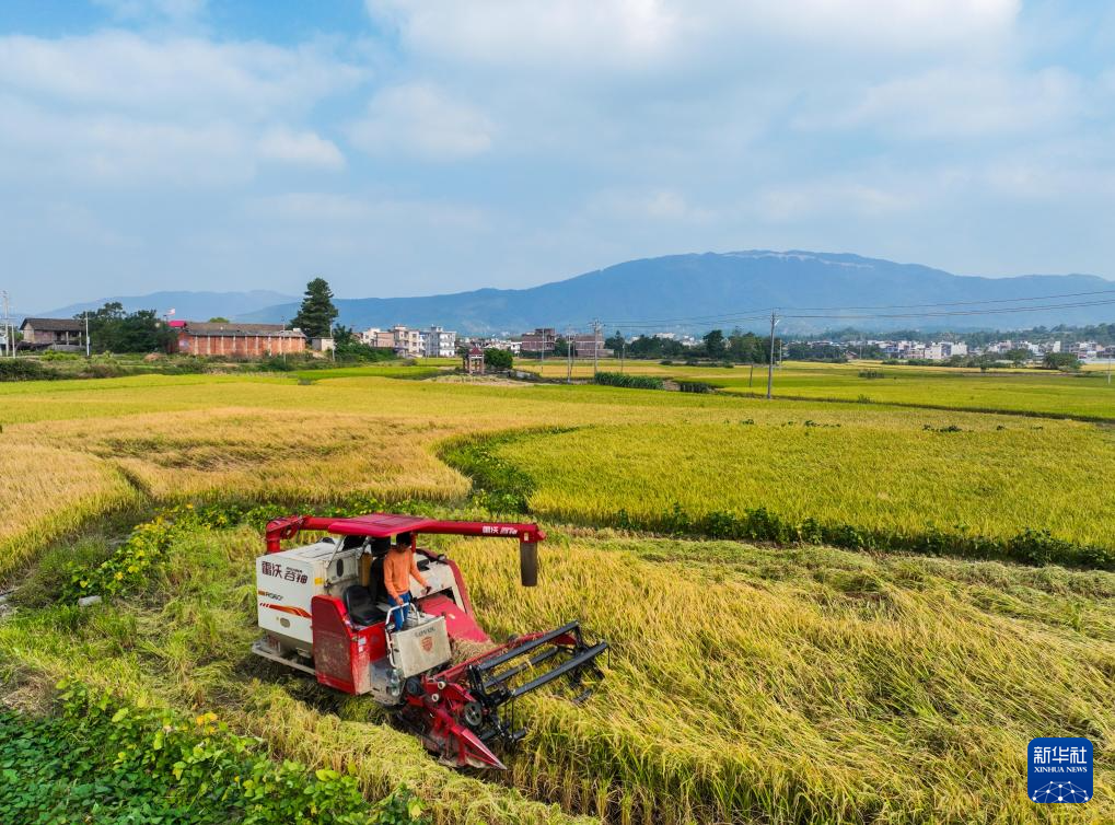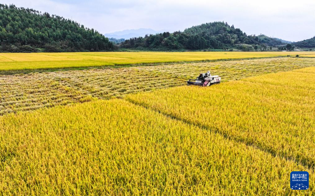10月8日,在湖南省永州市道县四马桥镇华山村,农机手驾驶机械收割晚稻(无人机照片)。