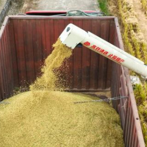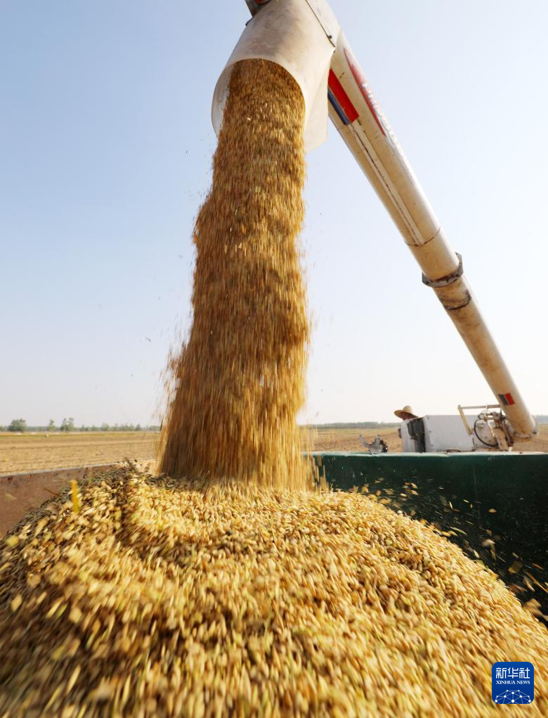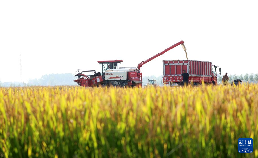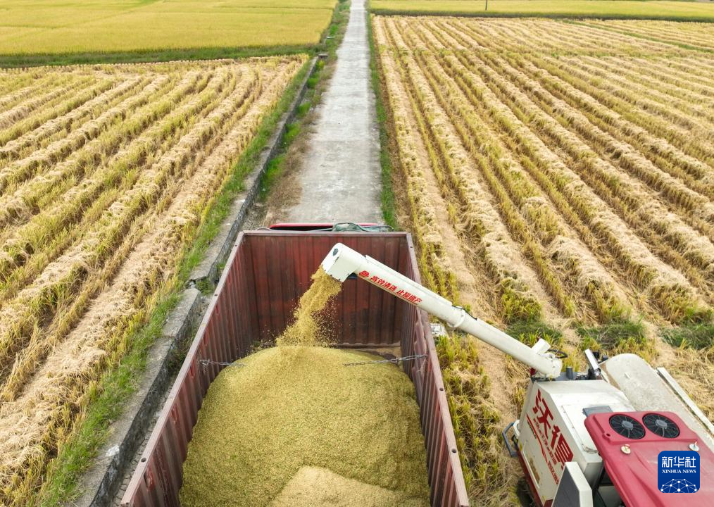 10月8日,湖南省常宁市三角塘镇长江村农民驾驶收割机将刚收获的稻谷卸进运粮车里(无人机照片)。