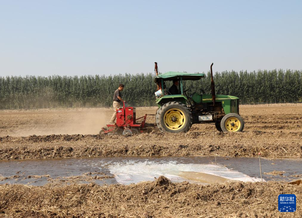 10月8日,农民驾驶农机在山东省淄博市高青县黑里寨镇一处农田里播种冬小麦。
