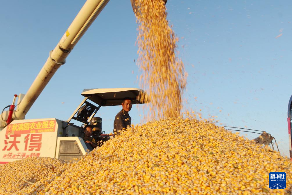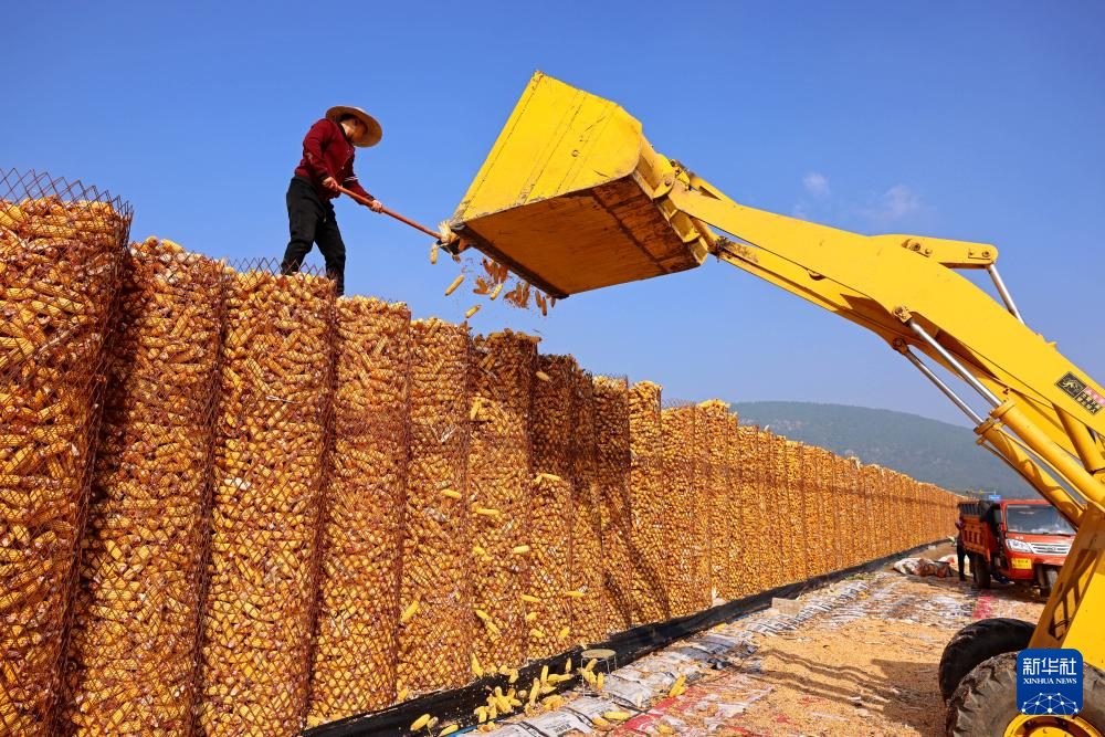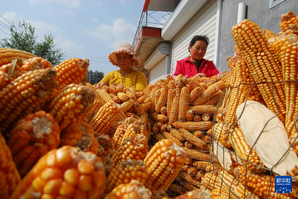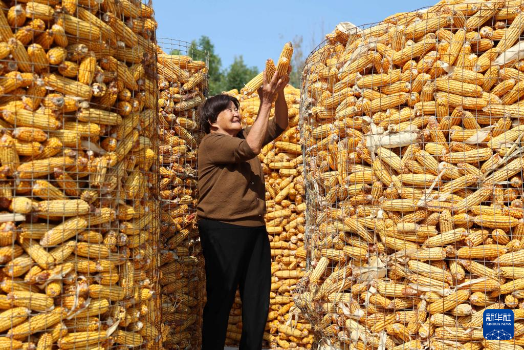 10月8日,在山东省青岛市即墨区移风店镇北住村,村民将收获的玉米封囤归仓。