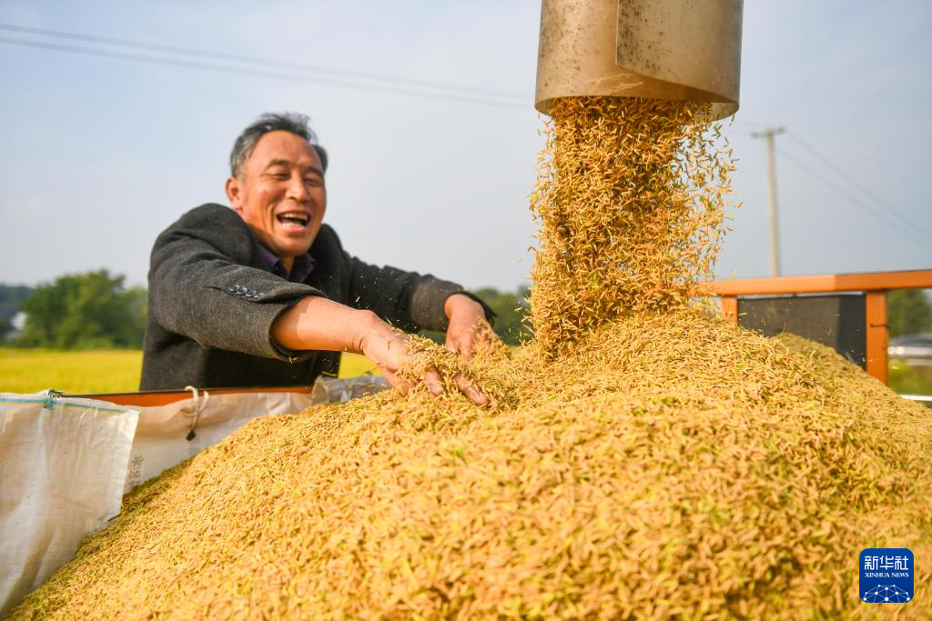 10月8日,在湖南省永州市道县四马桥镇华山村,农民在收获晚稻。