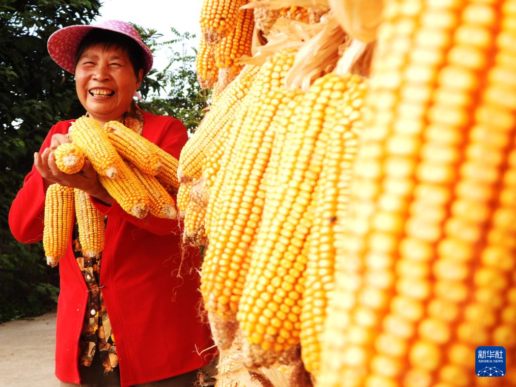 10月8日,在四川省达州市开江县回龙镇乐园村,村民在晾晒收获的玉米。