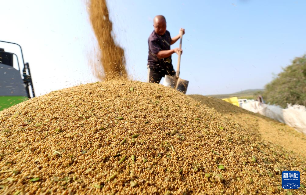 10月8日,在河北省石家庄市行唐县玉亭乡八里庄村,农户将收获的谷子装车。
