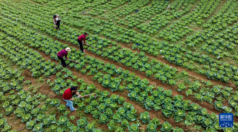 10月8日,村民在云南省文山壮族苗族自治州西畴县兴街镇多依坪村蔬菜基地劳作(无人机照片)。