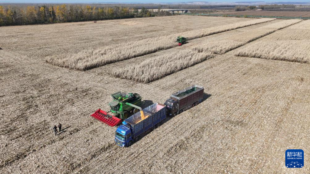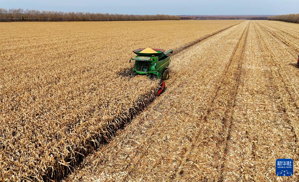 10月8日,在北大荒集团黑龙江五大连池农场有限公司玉米地块,机车在进行收获作业(无人机照片)。