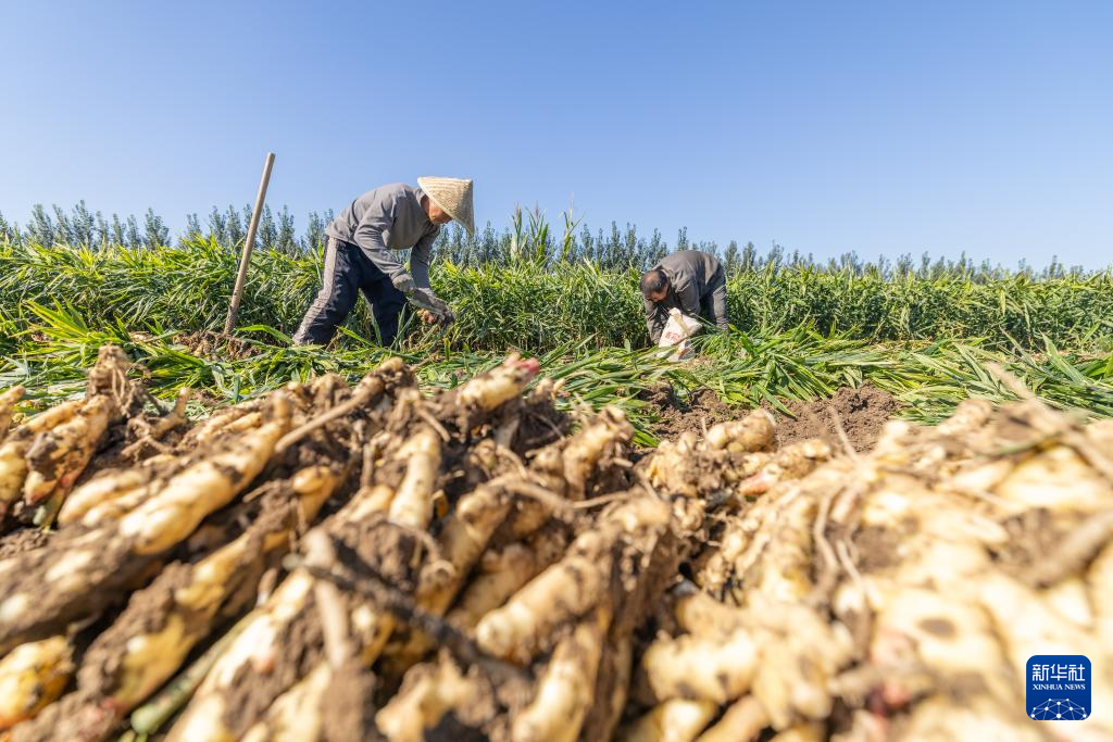 10月8日,河北省唐山市丰南区岔河镇四神庄二村的农民在田间收获生姜。