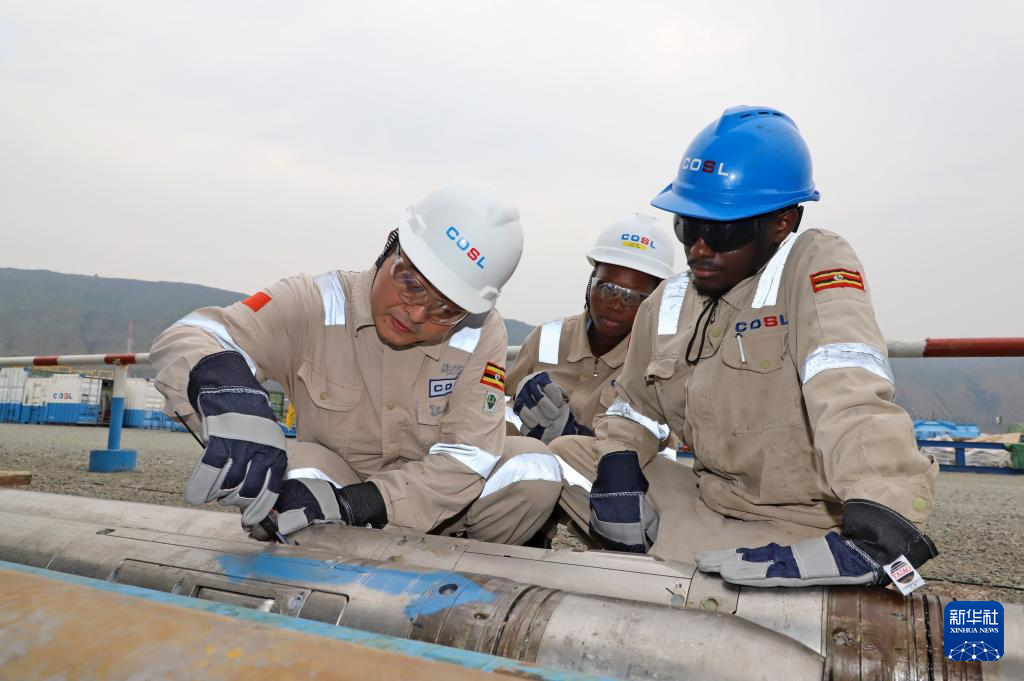 8月22日,在乌干达西部的翠鸟油田项目现场,来自中国和乌干达的工作人员对“璇玑”系统工具进行测量。