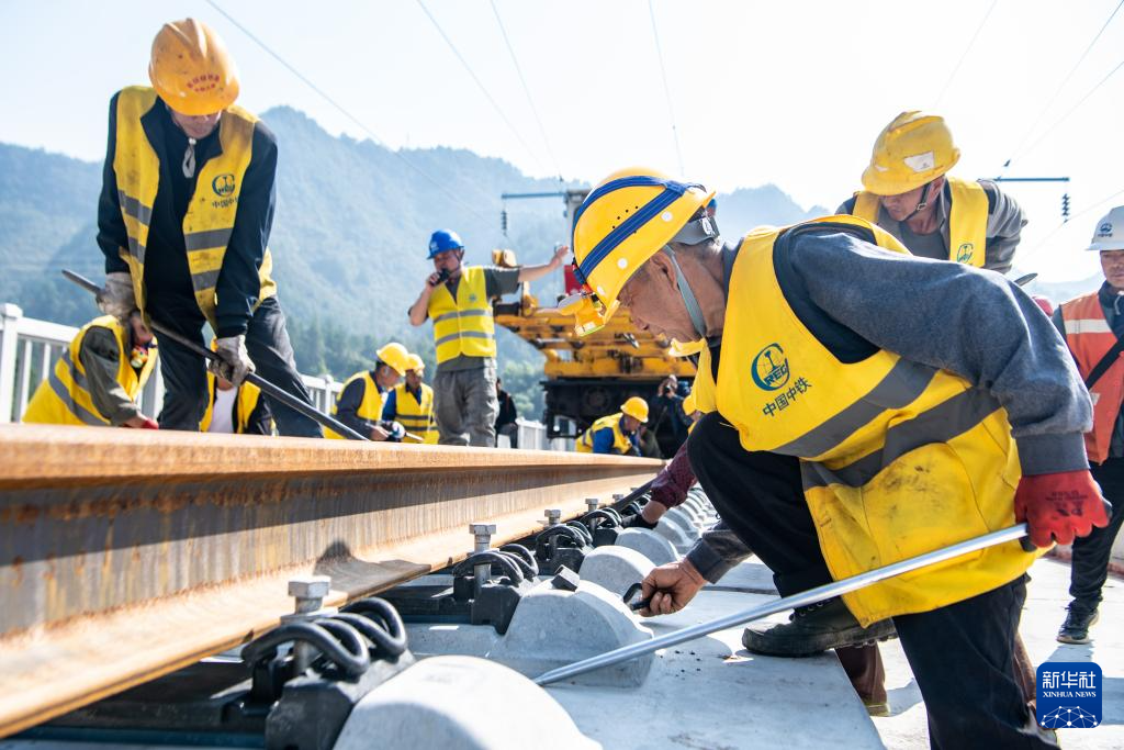10月9日,工人在渝厦高铁重庆东至黔江段施工现场进行铺轨作业。