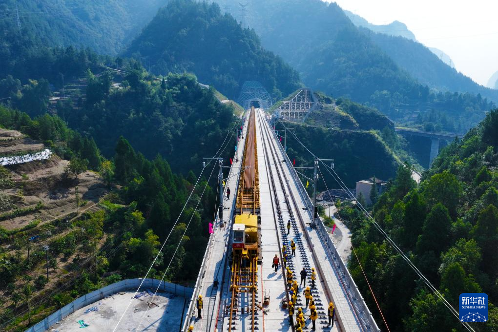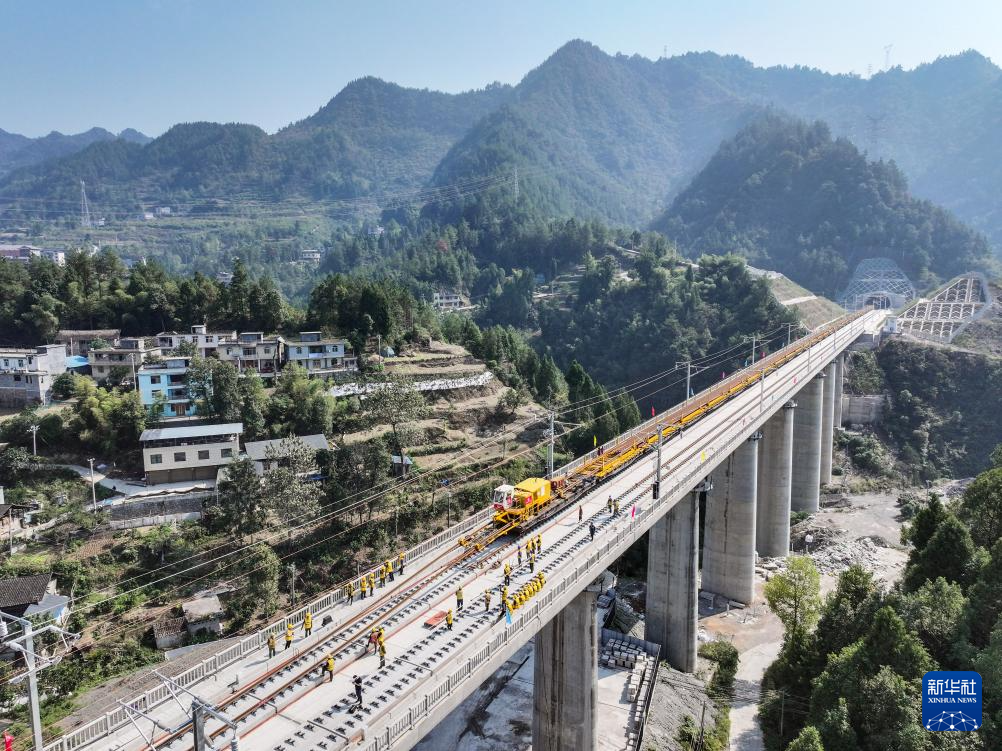 10月9日,工人在渝厦高铁重庆东至黔江段施工现场铺设轨道(无人机照片)。