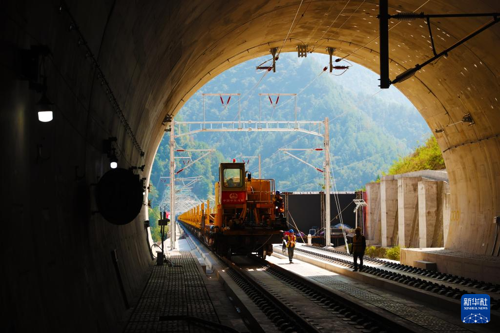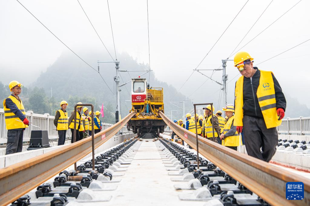 10月9日,工人在渝厦高铁重庆东至黔江段施工现场铺设轨道。