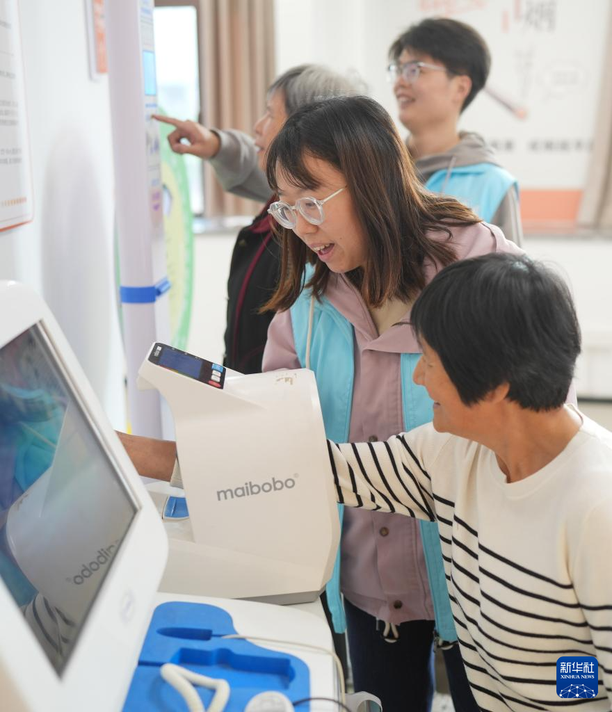 10月10日,社区工作人员带着新入住的老人体验社区自助医疗设备。