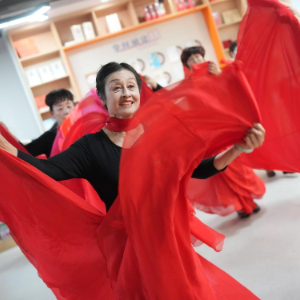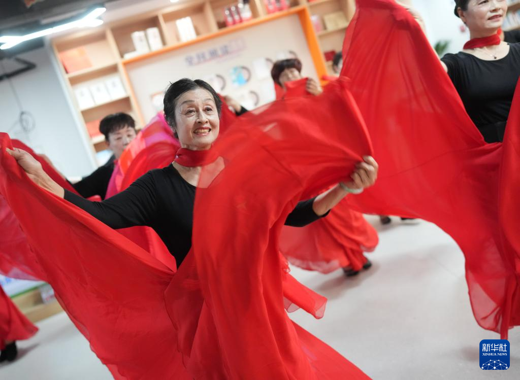 10月10日,老人们在社区邻里中心排练自编自演的舞蹈节目。