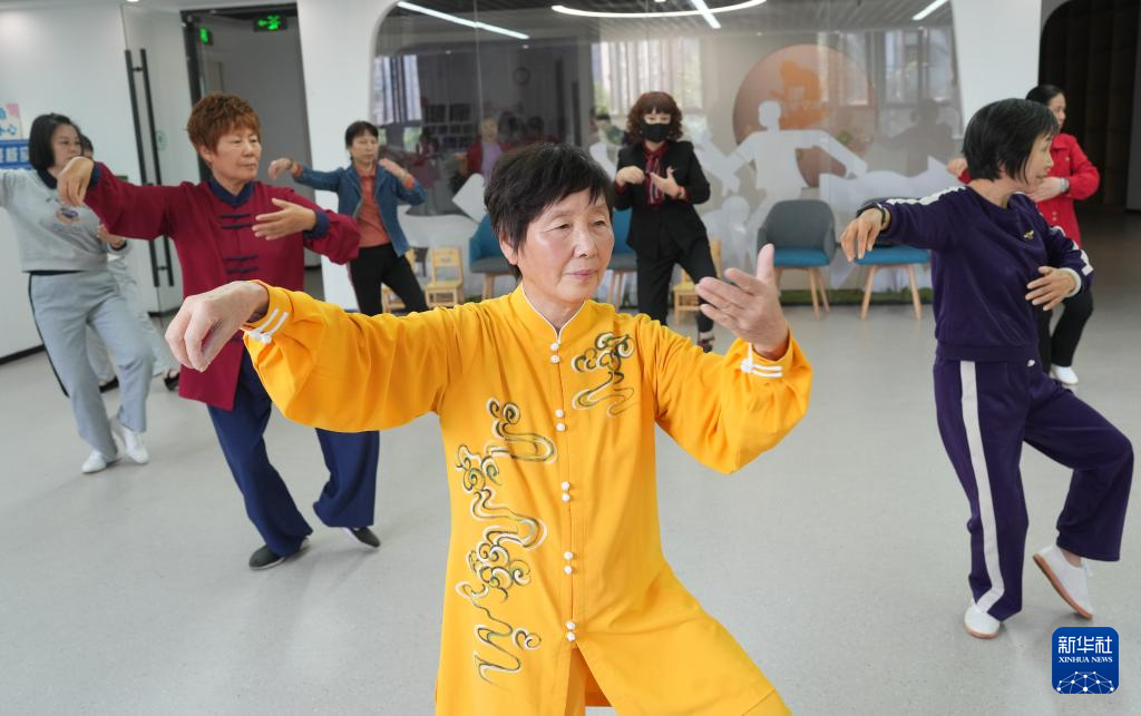 10月10日,老人们在社区邻里中心体验太极拳社团的活动。