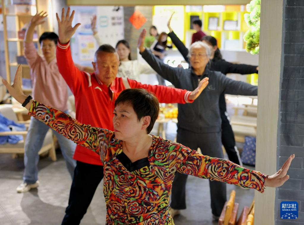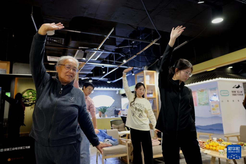 10月11日,全国职工健康促进工程办公室等单位在北京组织八段锦教学公益活动,西城区居民在长安商场的健康驿站学习八段锦。