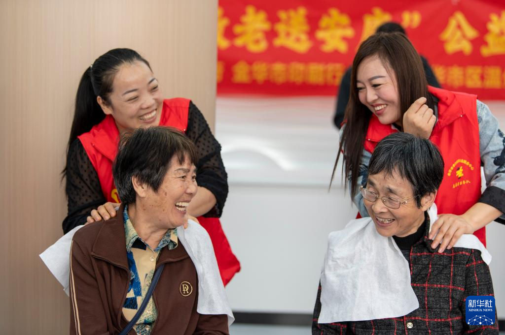 10月11日,在浙江省金华市洋埠镇洋埠村,志愿者给老人提供推拿服务,并开心拉家常。