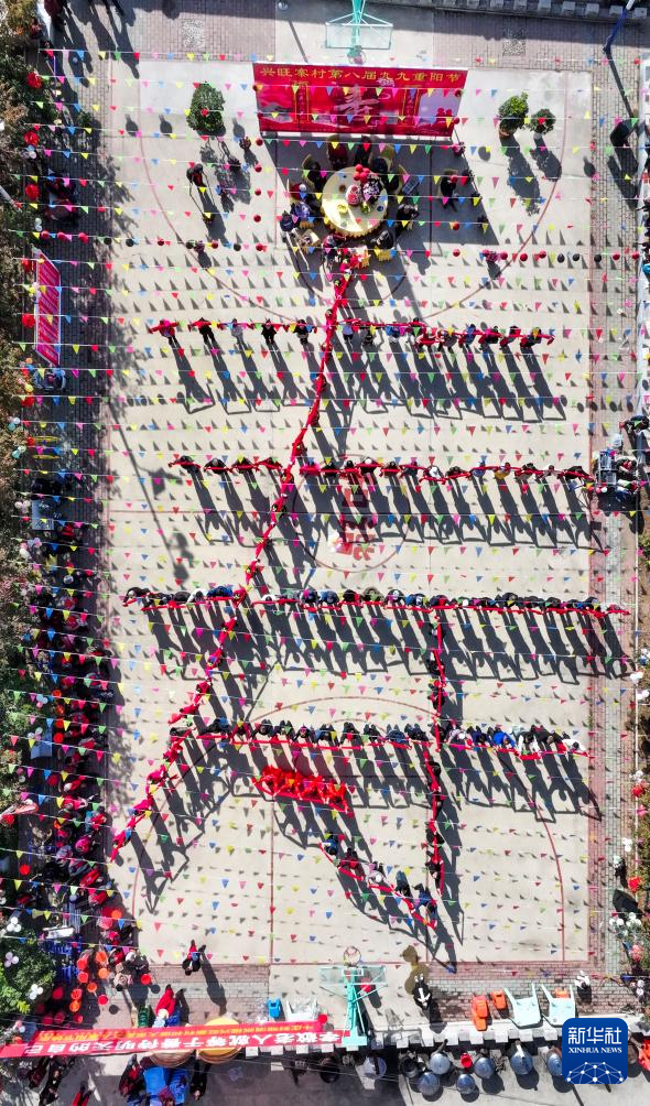 10月11日,河北省遵化市兴旺寨镇兴旺寨村村民摆出“寿”字造型祝福老人(无人机照片)。