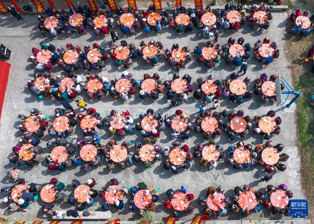 10月11日,河南省焦作市博爱县柏山镇柏山村举行传统敬老节活动,老人们在吃流水席(无人机照片)。