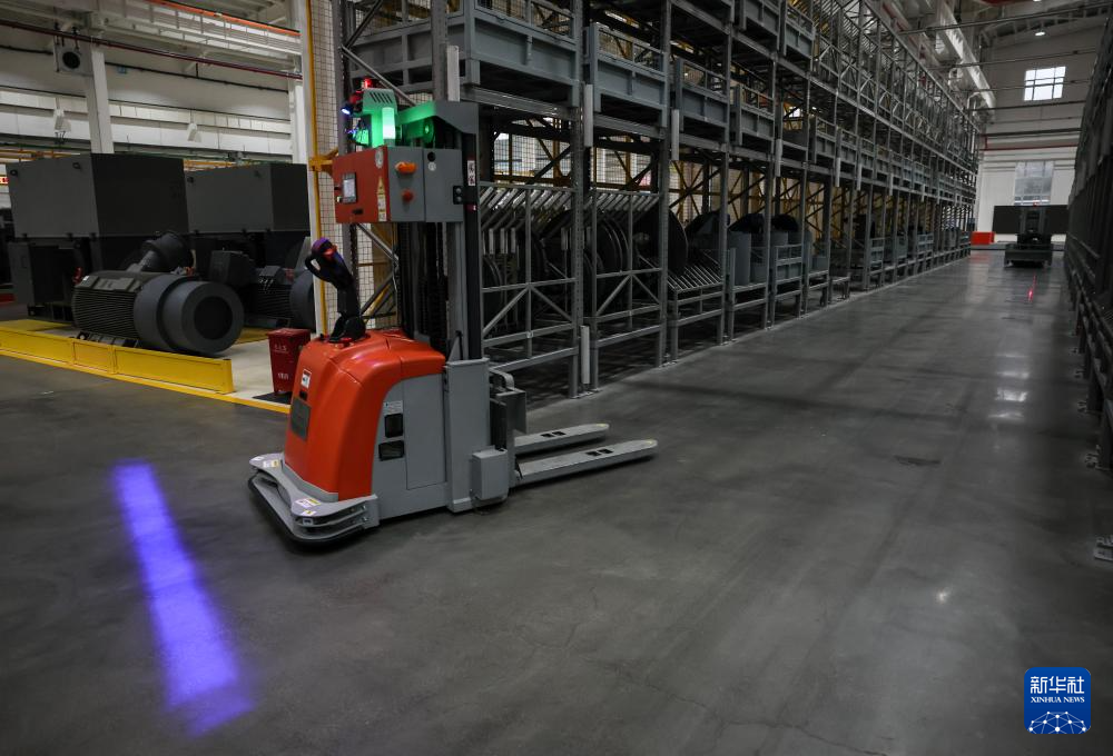 10月10日在哈电集团佳木斯电机股份有限公司的车间里拍摄的自动叉车。该公司持续在数字化、智能化建设与新产品研发和科技创新上加大力度,全面推进企业数字化转型。