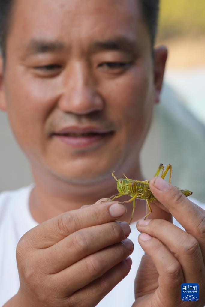 10月11日,院峪村党支部书记王增喜在检查蚂蚱生长情况。