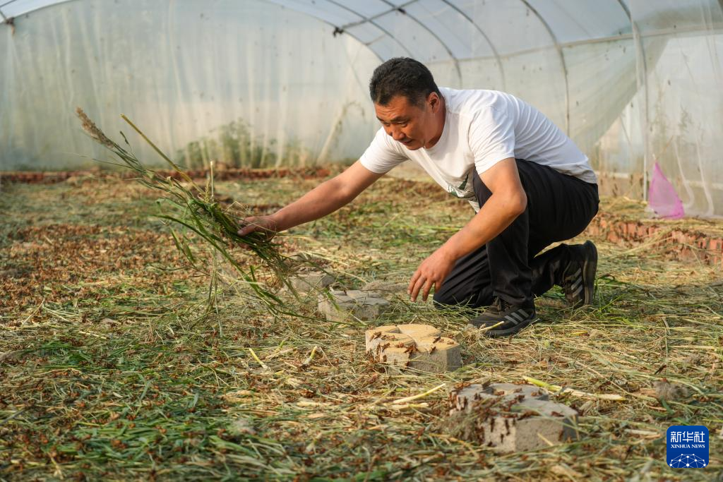 10月11日,院峪村党支部书记王增喜在蚂蚱大棚内投料喂食。