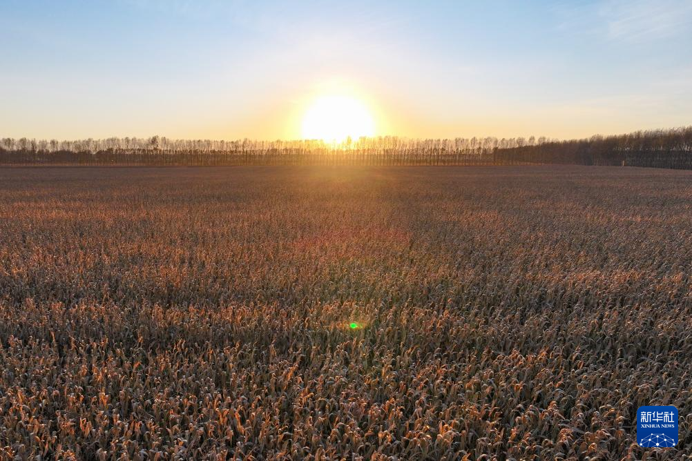 金秋时节,日落的阳光撒在黑龙江广袤的黑土地上,构成了一幅美丽的丰收画卷。
