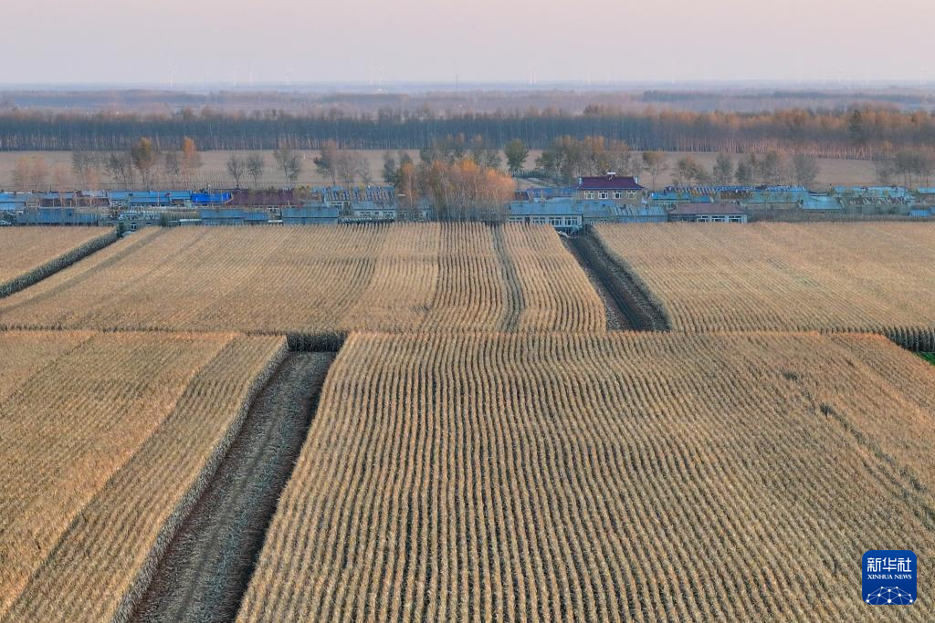 日落时分在肇东市五里明镇东升村拍摄的玉米地(无人机照片,10月11日摄)。
