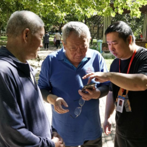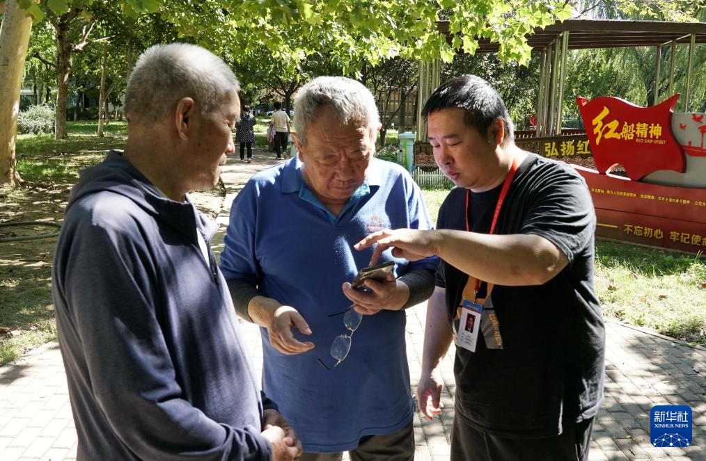 9月25日,北京市丰台区珠江紫台社区工作人员(右)帮助老年居民在手机上办理组织关系转接。