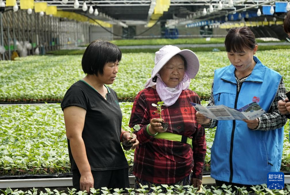 4月9日,北京市大兴区庞各庄镇的基层政务服务工作人员(右)在田间为农民解答农业相关政策。