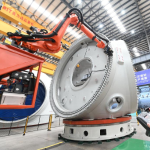 10月12日,在东方风电福建制造基地,机械臂正通过计算抓取风电机组机舱前机架偏航轴承的螺栓位置。