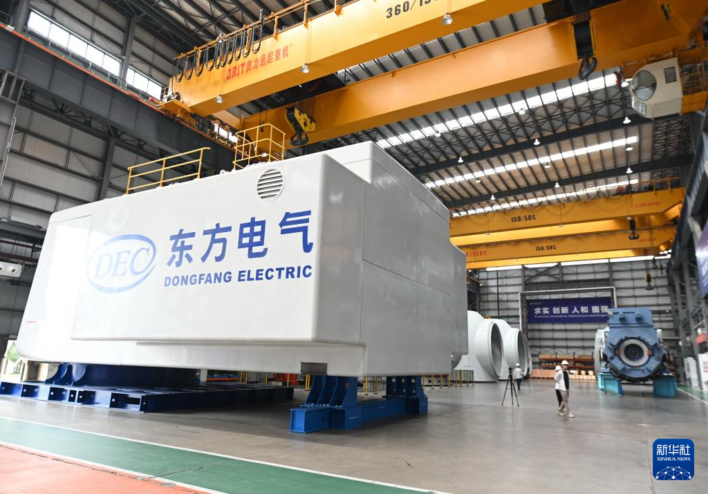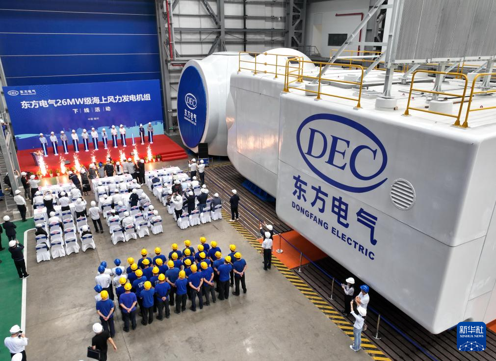 10月12日拍摄的26兆瓦级海上风力发电机组下线现场。