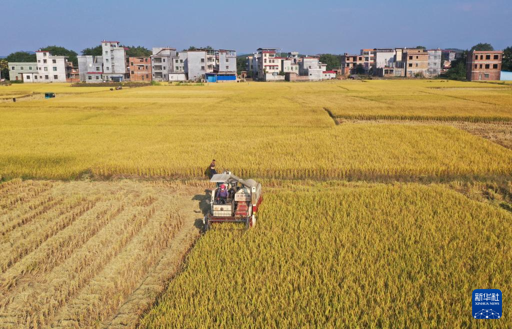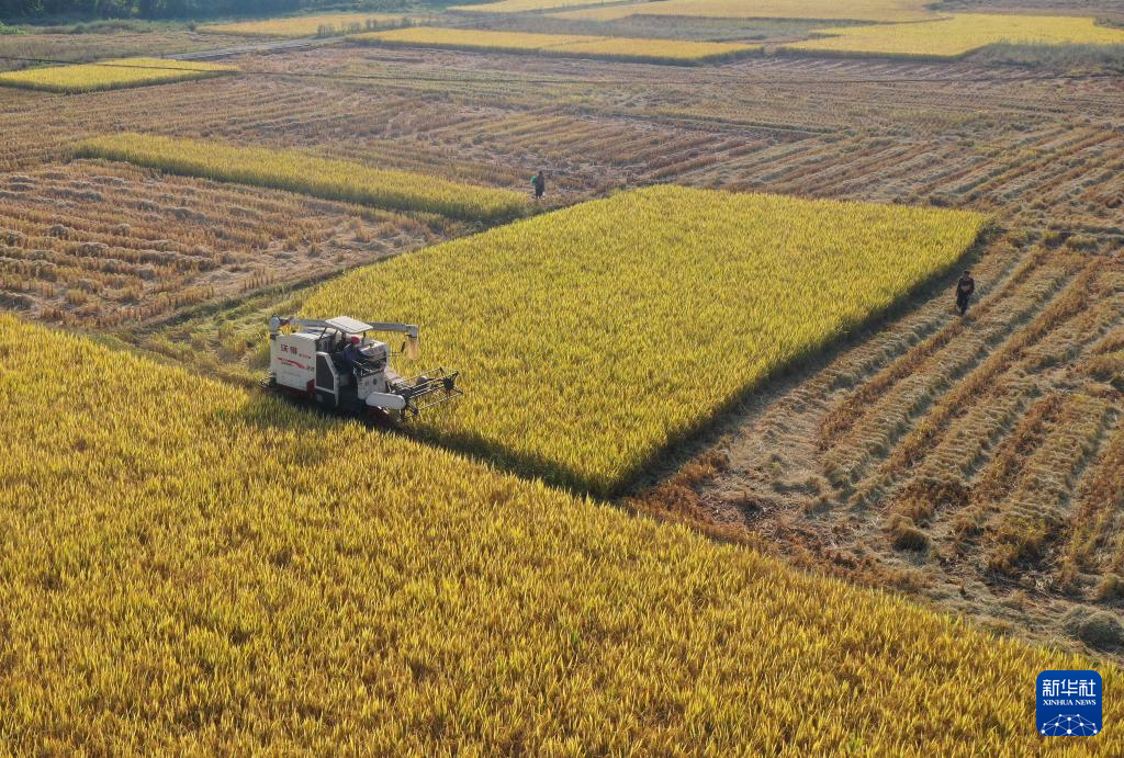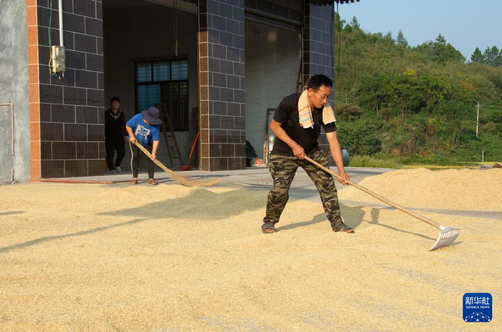 金秋时节,湖南省永州市蓝山县种植的晚稻迎来丰收,当地村民抢抓农时,收割水稻、晾晒稻谷。据介绍,蓝山县今年种植晚稻面积12.97万亩。