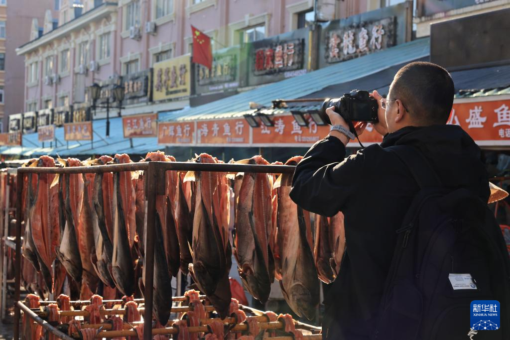 10月11日,游客在在黑龙江省抚远市的东极鱼市“打卡”拍照。