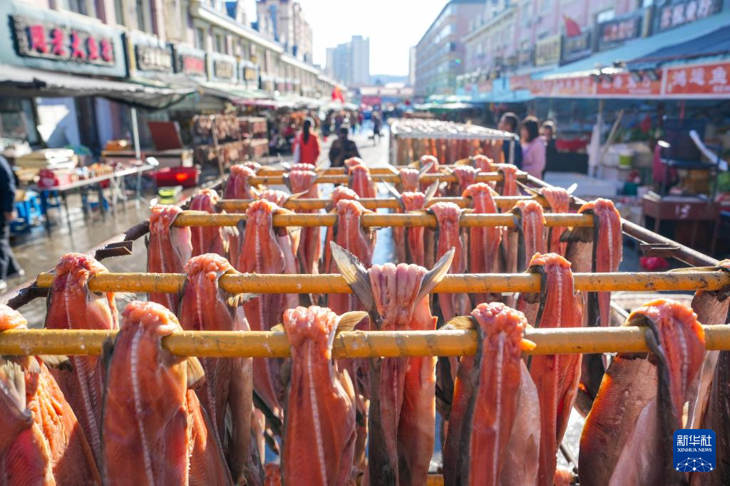 10月11日,在黑龙江省抚远市的东极鱼市上挂着供市民选购的鱼产品。