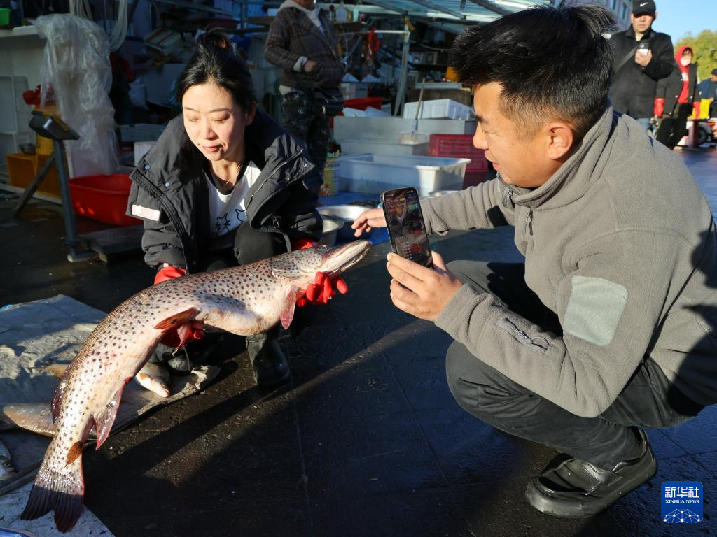 10月11日,在黑龙江省抚远市的东极鱼市,鱼贩在进行直播带货。