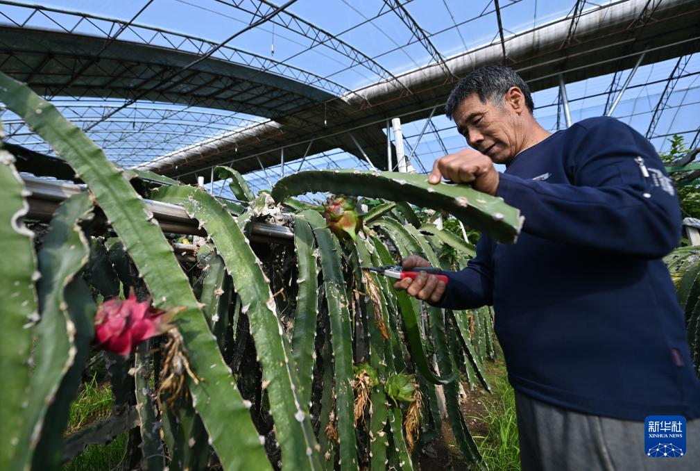 10月12日,在天津市蓟州区穿芳峪镇大巨各庄村,村民在火龙果种植区剪苗。