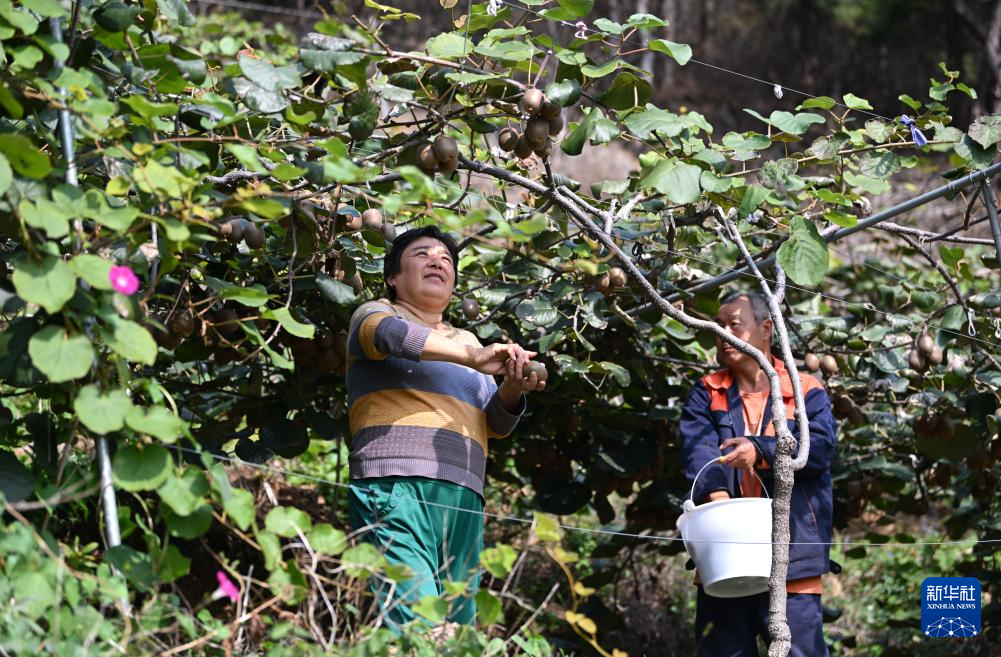 10月12日,在天津市蓟州区马伸桥镇大峪村,种植户在采摘猕猴桃。